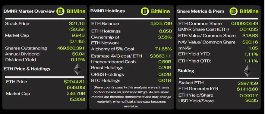 Bu son alımla birlikte Bitmine’in toplam Ethereum varlığı 4,3 milyon ETH’nin üzerine çıktı. Şirketin en son resmi açıklamasına göre bu miktar, mevcut piyasa fiyatlarıyla 9 milyar doların üzerinde bir değere karşılık geliyor. Bitmine ayrıca, uzun vadeli hedefleri doğrultusunda Ethereum’un dolaşımdaki arzının %5’ini satın alma planının %72’sine ulaştığını duyurarak, agresif ancak kademeli ilerleyen hazine stratejisinde önemli bir aşamayı geride bıraktığını vurguladı.